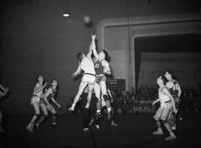 Image shows a Basketball game between Texas Wesleyan College and Trinity University. Eight unidentified basketball players, from left to right, in center a skirmish between teams struggle for control of the basketball. Unidentified referee is shown in center behind players. They are wearing their team uniforms. Spectators are seated on benches on the side of the court. Published in The Fort Worth Star-Telegram morning edition, February 22, 1940.