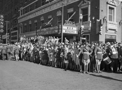 The Texas Christian University Horned Frogs are hosting the visiting Texas A&M Aggies at Amon G. Carter Stadium in Fort Worth, Texas. Thousands of football fans traveled from all over to catch the game and attend the pregame parade in downtown Fort Worth. A crowd of people are packed on the sidewalks of Main Street as the Aggie Marching band passes by. The Texas marquee sign is advertising "Lunch, Dine, Dance and the Den Tony Di Pardos Orchestra". Further down the street is the Worth building and Bond Clothes. Published in The Fort Worth Star-Telegram morning edition, October 19, 1941.