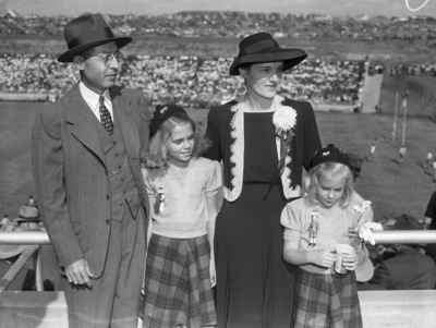 The Texas Christian University Horned Frogs are hosting the visiting Texas A&M Aggies at Amon G. Carter Stadium in Fort Worth, Texas. Thousands of football fans traveled from all over to catch the game. In attendance left to right are E. G. Ashe, Eleanor Jeffrey, Mrs. Ashe, and Nancy Jeffrey. Mr. and Mrs. Ashe are the proud parents of Aggie Sweetheart for the day Miss Anna Ruth Ashe. Eleanor and Nancy are the daughters of Mr. and Mrs. Lewis Jeffrey, neighbors to the Ashe Family. Mr. Ashe is dressed in a hat and a three piece pinstripe suit. Elanor, ten, is wearing a hat, sweater, and a plaid skirt. Mrs. Ashe is wearing a hat, dress, blazer, and a corsage. Nancy, six, is wearing an outfit matching her sister. The field and players are in the background. Published in The Fort Worth Star-Telegram morning edition, October 19, 1941.