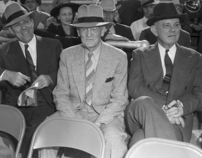 The Texas Christian University Horned Frogs are hosting the visiting Texas A&M Aggies at Amon G. Carter Stadium in Fort Worth, Texas. Thousands of football fans traveled from all over to catch the game. In attendance left to right are N. L. Leachman, General H. J. Brees, and Dr. T. O. Walton. On the second row are Mr. and Mrs. Jake Miller. Mr. Leachman, of Dallas, Texas, is a retired A&M director. He is wearing a hat and a dark suit. General Brees, of San Antonio, Texas, is also a retired A&M director. He is wearing a hat and an unbuttoned three-piece suit, and eyeglasses. Dr. Walton, is the president of A&M. He is dressed in a hat and a double breasted suit, and smoking a cigar. The Millers are ranchers in Coleman, Texas. Mrs. Miller is wearing a hat, blouse, and blazer. Mr. Miller is dressed in a cowboy hat and a suit. Published in The Fort Worth Star-Telegram morning edition, October 19, 1941.