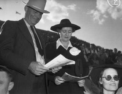The Texas Christian University Horned Frogs are hosting the visiting Texas A&M Aggies at Amon G. Carter Stadium in Fort Worth, Texas. Thousands of football fans traveled from all over to catch the game. In attendance are Mr. and Mrs. Bill Springer. The ranchers from Aspermont, Texas have traveled two-hundred miles to see the game. Mr. Springer is dressed in a hat and a pinstripe suit. Mrs. Springer is wearing a hat, collared blouse, blazer, and a skirt. They are standing in the grandstands and looking at newspapers in hand. Published in the Fort Worth Star-Telegram evening edition, October 20, 1941.