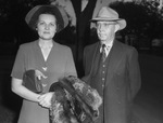 The Texas Christian University Horned Frogs are hosting the visiting Texas A&M Aggies at Amon G. Carter Stadium in Fort Worth, Texas. Thousands of football fans traveled from all over to catch the game. Arriving at the stadium are Mr. and Mrs. John Reynolds, of Kent, Texas. Mrs. Reynolds is wearing a hat, button-up blouse, and a skirt. Her purse is tucked under her arm and a she is carrying a coat. Mr. Reynolds is dressed in a hat and a three-piece, double breasted suit. Published in the Fort Worth Star-Telegram evening edition, October 20, 1941.