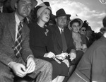 The Texas Christian University Horned Frogs are hosting the visiting Texas A&M Aggies at Amon G. Carter Stadium in Fort Worth, Texas. Thousands of football fans traveled from all over to catch the game. In attendance left to right are Mr. and Mrs. Ted Alexander and Mr. and Mrs. H. M. Breedlove. Mr. and Mrs. Alexander are visiting Fort Worth from Canada. Mr. Alexander is dressed in a hat and a tweed suit. Mrs. Alexander is wearing a hat, button-up dress, and a brooch. Mr. and Mrs. Breedlove are from Clarendon, Texas. Mr. Breedlove is dressed in a hat and a pinstripe suit. Mrs. Breedlove is wearing a hat and a button-up blouse.