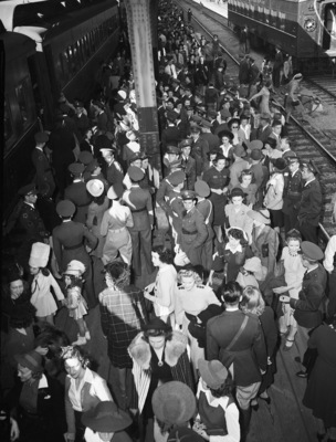 The Texas Christian University Horned Frogs are hosting the visiting Texas A&M Aggies at Amon G. Carter Stadium in Fort Worth, Texas. Thousands of football fans traveled from all over to catch the game. Arriving at the Texas and Pacific Railway Station are A&M cadets and students from Texas State College for Women (TSCW). A large crowd of people are stepping off the train and onto the platform. Near the bottom, left of the crowd are two young girls in band uniforms. They are the mascots of the Fort Worth all-city ROTC Band. Ramona Lester, eight is on the left and Carmen Hinds, seven, is holding her hand. Published in the Fort Worth Star-Telegram morning edition, October 19, 1941.
