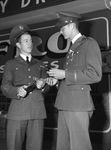The Texas Christian University Horned Frogs are hosting the visiting Texas A&M Aggies at Amon G. Carter Stadium in Fort Worth, Texas. Thousands of football fans traveled from all over to catch the game. Aggie fans virtually took over the downtown area before the game Saturday morning. Enjoying the pregame festivities left to right are Aggie cadets Uvalde Stoermer and E. E. Liebhafsky. Mr. Stoermer, of Yoakum, Texas, is handing Mr. Liebhafsky, Shiner, Texas, a few dollars. Both men are dressed in military uniforms. Published Fort Worth Star-Telegram Evening Edition October 18, 1941.