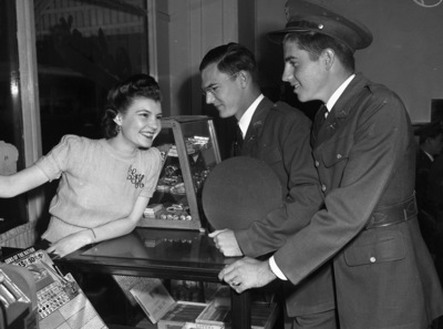 The Texas Christian University Horned Frogs are hosting the visiting Texas A&M Aggies at Amon G. Carter Stadium in Fort Worth, Texas. Thousands of football fans traveled from all over to catch the game. Aggie fans virtually took over the downtown area before the game Saturday morning. Left to right are Leonette Hale, Bill Miskimins, and Travis Kirkpatrick. Miss Hale is the cashier at a cafe. She is leaning on a glass counter, wearing a sweater embroidered with her initials. Mr. Miskimins is an Aggie cadet from Wichita Falls, Texas. He is dressed in a military uniform. Mr. Kirkpatrick is an Aggie cadet from Hillsboro, Texas. He is also wearing a military uniform. The glass display on the counter is displaying sweet treats. Published Fort Worth Star-Telegram Evening Edition October 18, 1941.