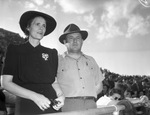 The Texas Christian University Horned Frogs are hosting the visiting Texas A&M Aggies at Amon G. Carter Stadium in Fort Worth, Texas. Thousands of football fans traveled from all over to catch the game. In attendance are Mr. and Mrs. A. L. Pate, of Brownwood, Texas. They are standing in the stands, watching a crucial play. Mrs. Pate is wearing a hat, button-up dress, and a brooch. Mr. Pate is dressed in a hat, short-sleeved shirt, and trousers. Published Fort Worth Star-Telegram Sunday Edition October 19, 1941.