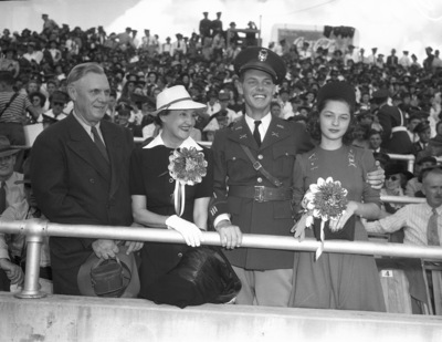 The Texas Christian University Horned Frogs are hosting the visiting Texas A&M Aggies at Amon G. Carter Stadium in Fort Worth, Texas. Thousands of football fans traveled from all over to catch the game. In attendance left to right are Mr. and Mrs. Tom Gillis, Cadet Colonel Tom Gillis Junior, and Miss Anna Ruth Ashe. Mr. Gillis is dressed in a double breasted suit and holding his hat. Mrs. Gillis is wearing a hat, button-up dress, gloves, and a mum. Cadet Colonel Gillis is an A&M cadet commandant. He is dressed in a military uniform. Miss Ashe is a student at Texas State College for Women and was named the Aggie Sweetheart for the game. She is wearing a hat, dress, pins, and a mum. Published Fort Worth Star-Telegram Morning Edition October 19, 1941.
