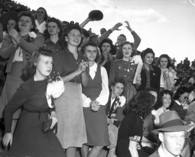 The Texas Christian University Horned Frogs are hosting the visiting Texas A&M Aggies at Amon G. Carter Stadium in Fort Worth, Texas. Thousands of football fans traveled from all over to catch the game. A portion of the T. C. U. student body is shown in the west stands of the stadium. They are cheering as the second half of the game opened with a kick-off. The T.C.U. Frogs took the northern end and west stands so that the visiting A&M cadets might have the entire east stands to themselves. The courtesy move provoked some murmurs among the T. C. U. students, but at least there was no sun in their eyes during the game. The Frogs went on to win the game 14-7. Published Fort Worth Star-Telegram Morning Edition October 19, 1941.