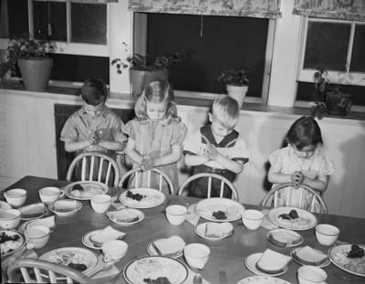 Singing grace before their evening meal at the All-Church Home are, left to right, Sam Smith (five years old), Sylvia Keen (five), Earl Brown (four) and Ann Morris (three). The children are standing behind a dining table with their heads bowed and their hands in prayer. On the table are plates of food, glassware and utensils. The girls are wearing dresses and the boys are dressed in shirts and trousers. Behind them, on the back wall, are windows that have potted plants resting on the window sills.