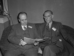 Ben H. Powell of Austin, left, retiring president of the Texas Bar Association, read the last issue of the Texas Compatriot, organ of the Texas Society of the Sons of the American Revolution, in the company of its editor, Dr. Valin R. Woodward of Arlington, at the annual meeting of the organization. Dr. Woodward is past president of the society. Powell was elected first vice president. Published in the Fort Worth Star-Telegram morning edition, February 23, 1940.