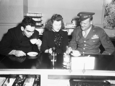 • Left to right, Mrs. Fannie Coffey, her son, Staff Sergeant Milton Coffey, and her daughter, Miss Frances Coffey