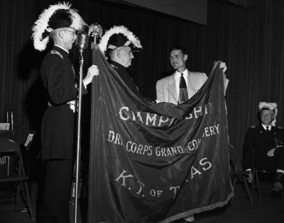 Grand Commander Thomas M. Bethell, middle, of Greenville presented the state championship banner Monday night in Masonic Temple to J. E. McKee of Dallas, captain of the Tancred Commandery drill team which won first place against five other contenders in drill competition Monday morning at Farrington Field. Worth Commandery, winner last year, placed second.