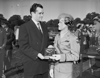 Lieutenant Colonel Doris Caldwell, captain of the Amon Carter Riverside High School cadet sponsors team, receives a plaque from Robert F. Ladd for her winning team in the annual Reserve Officers' Training Corps (ROTC) cadet sponsors' rifle match.