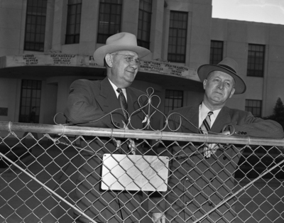 Fred Cutter, right, and E. F. Crites are shown at Meacham Field before they boarded a chartered plane with other Fort Worth business men for "Operation Howdy," good will trip to the trans-Pecos and Big Bend areas. It's a Chamber of Commerce project. Published in Fort Worth Star-Telegram evening edition April 24, 1951.