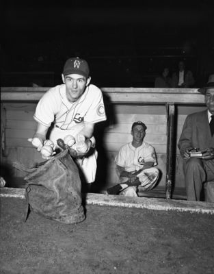 Mel Himes faces sports. A man on the field wearing a baseball hat and clothing, taking baseballs out of bag. A man in the dug out sitting down wearing baseball uniform and another man standing in and out of the dug out wearing a suit. Published in Fort Worth Star-Telegram morning edition, May 12, 1951.