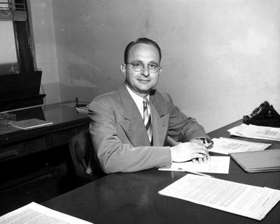 Image shows a bust shot of J. C. Cooper, senior gas engineer for Stanolind Oil & Gas Company. He is shown seated at desk. Published in the Fort Worth Star-Telegram morning edition May 6, 1951.