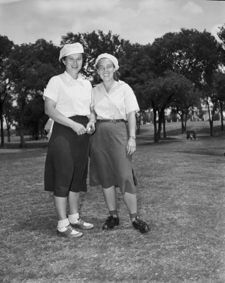 Mrs. J. I. Stephensen (left) and defending champion Polly Riley pause to chat before beginning 36-hole clash for the city women's title at Colonial. Polly kept crown, 8-7. Published in Fort Worth Star-Telegram morning edition, April 29, 1951.