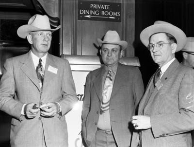 Image shows three men meeting at the Texas & Southwestern Cattle Raisers Association. From left to right, Cecil Rourk, Marfa; John Bailey, Pawhuska, Oklahoma; and Bill Grogan, St. Louis, Missouri.