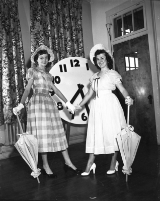 Mary Jane Henson, left, and Rose Ann Hanes, will be two of the home economics students at J. P. Elder Junior High featured in a musical style show, "Around the Clock Revenue" in the school auditorium. Published in Fort Worth Star-Telegram, morning edition March 14, 1951.