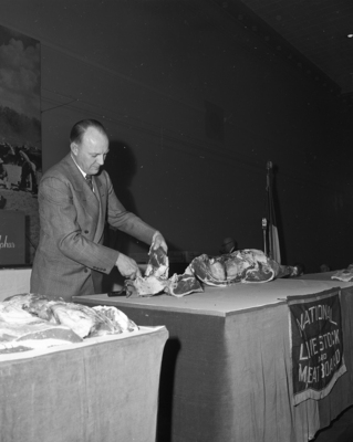 Army methods of meat preparation were demonstrated for the Texas and Southwestern Cattle Raisers Association in Dallas by R. O. Roth, assistant director of the National Livestock and Meat Board, shown here making a cut from piece of boneless beef. Published in Fort Worth Star-Telegram, morning edition March 16, 1951.