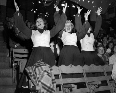 Image shows three North Side Cheer leaders give support to Steers. From left to right, Kitty Malone, Doris Barton and unidentified.