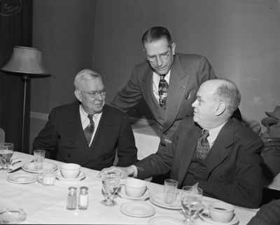Making plans here for the 1952 convention of the American National Livestock Association were Joe Reynolds, left, Joe Clarke, local convention committee chairman, and F. E. Mollin of Denver, executive secretary of the ANLA. Reynolds is an association director and will head local committee arrangements. Published in Fort Worth Star-Telegram, evening edition March 15, 1951.