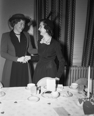 Mrs. W. Bassett Orr, greets Mrs. Tom C. Steele, who recently moved to Fort Worth from Allenton, Michigan. Mrs. Orr is president of the Newcomers' Club, and Mrs. Steele is a new member.