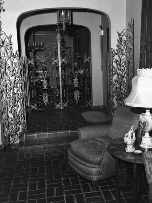 The Spanish home of Dr. Mrs. X. R. Hyde on River Lake Drive shows French, Italian, Turkish and American influences on the inside. Picture shows a view of Italian iron gates to the dining room as seen from the living room through the entry hall. Published in Fort Worth Star-Telegram morning edition April 8, 1951.