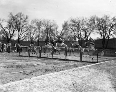 Image shows five hurdle players competing. It is shown that Arlington Height's leads high hurdle qualifiers. Left to right, North Dallas' Jay Winders, Gainesville's Gayle Carnes, Williams, London's Joe Grace and Philip's James Reddick. Published in the Fort Worth Star-Telegram evening edition, March 17, 1951.