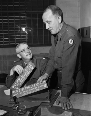 Lt. Col. William C. Lafield, left, is placing his name plaque on the desk space being vacated by Lt. Col. Kurt Schnellenbach as Lafield took over the duties of executive officer at the Fort Worth Quartermaster Depot. Schnellenbach is being transferred to California as deputy corps quartermaster. Published in Fort Worth Star-Telegram, evening edition March 16, 1951.