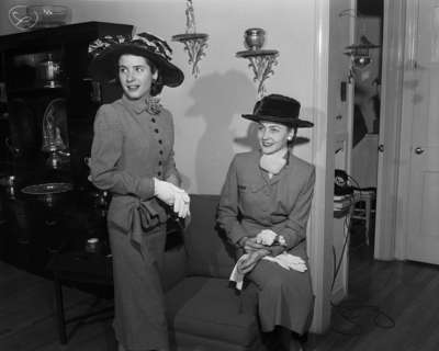Two young matrons, Mrs. B. T. Erwin Jr., left, and Mrs. Rex J. Howard try on a pair of old-fashioned hats from 25 years ago with their new suites and white gloves. Published in Fort Worth Star-Telegram, morning edition March 25, 1951.