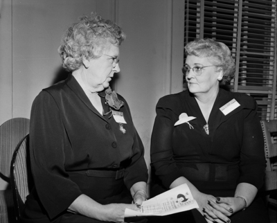 Mrs. Bessie Carter of San Angelo, left, chats with another West Texan at the State Rebekah Assembly, Mrs. Sadie Patterson, right, of Abilene who is state adviser of the Theta Rhos Girls Club of Texas. Mrs. Carter is a past president of the Assembly. Published in Fort Worth Star-Telegram, morning edition March 20, 1951.