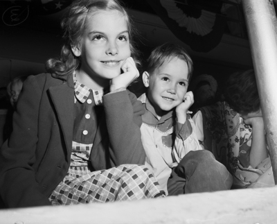 Billy Graham's energetic song leader, Cliff Barrows had 10,000 children saying "uncle". Deanna Roberts, 9, daughter of MR. and Mrs. T. H. Roberts of 3013 Ramona Dr., and her cousin, William Casey, 6, son of Mr. and Mrs. H. C. Casey of 7504 Rosewood, watch with rapt attention. Published in Fort Worth Star-Telegram, morning edition March 18, 1951.