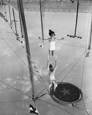 Not a young man's fancy but the opening rehearsal of the Gainesville Community Circus shows that spring is on the way. One of the feature acts this year is this upside down unicycle, pedaled high in the air by Ralph Gerneth, who supports the daring Miss Mary Louise Bezner. Published in Fort Worth Star-Telegram, evening edition March 19, 1951.