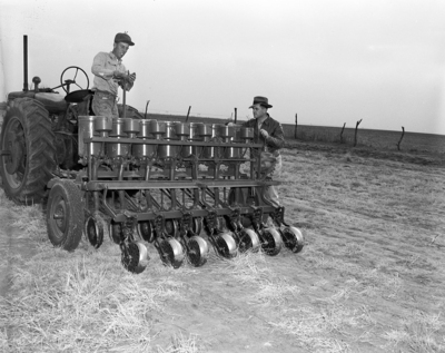 Image shows a grass seed drill owned by Wichita Wilbarger Soil Conservation District on the Bill Burnett Ranch. It is reseeding old fields. Bill Watts, left, operates the drill. James Park, SCS work unit conservationist, right, is checking with Park. Published in the Fort Worth Star-Telegram April 1951.