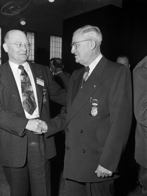 Joe Looney, left, of Wewoka, Oklahoma, deputy sovereign grand master of the Odd Fellows, welcomes Lynn J. Irwin, right, of Des Moines, to state convention. Irwin, who is grand sire of the sovereign grand lodge, described a plan for all out civilian defense aid of the 2,000,000 Odd Fellows and Rebekahs. Published in Fort Worth Star-Telegram, evening edition March 19, 1951.