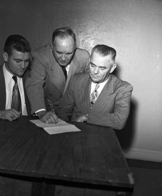 Salesmanship aids are explained here by Frank Walsh, center, vice president in charge of feed sales for Universal Mills, to J. W. Elder of Ranger, left, who led as top salesman in December and January, and Lewis A Lawrence of Fort Worth, right, newest addition to the sales force.