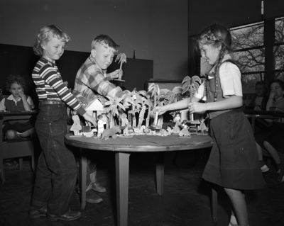 Pictured here are third grade students at Oak Knoll Elementary School, left to right, Sandra Wilder, Don Renfro, and Judith Nickerson are seen preparing exhibits to be seen at the school's open house event.