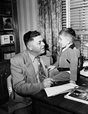 Image shows Calvin H. Carriker seated at work desk visiting with his grandson, Stuart Carriker, right, seated on top of desk. Published in the Fort Worth Star-Telegram June 1951.