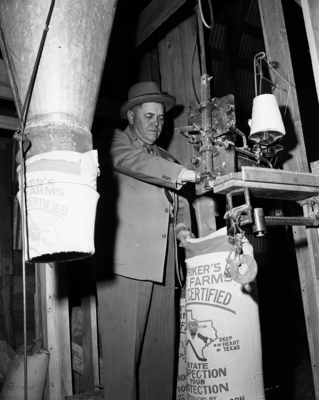 Image shows Calvin H. Carriker operating a sack stitcher. Left is a sacker that Carriker developed to load exactly 100 pounds of seed into each bag. Published in the Fort Worth Star-Telegram June 1951.