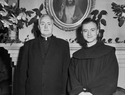 Rev. Emmanuel Sprigler C. P., of Cincinnati, left, and Rev. Jordan Schell O. F. M., Chicago, were in Fort Worth at St. Patrick's Church for Holy Week services. Father Sprigler is conducting Holy Week services at the church and Father Schell held a triduum for the Third Order of St. Francis. Published in Fort Worth Star-Telegram, evening edition March 22, 1951.