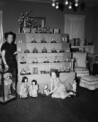Mrs John Lloyd and her daughter, Amelia at their home, 2944 College, explains the custom of the Japanese "Girl's festival." Mrs. Llyod's display of exquisite, miniature court figures, including 1,200 dolls from all over the world.
