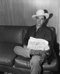 Portrait of Stuart Hamblen shown with newspaper. Published in Fort Worth Star-Telegram, evening edition March 21, 1951.