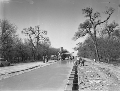 Concrete was being poured for the four-inch concrete base of the $168,000 widening project on University Dr. in Trinity Park. Contractors have been delayed by bad weather and completion date has been changed. Next project after completion of widening from Crestline to T&P tracks and from tracks to the Trinity Clear Forl will be construction of a new steel bridge across the Trinity. Published in Fort Worth Star-Telegram, evening edition March 21, 1951.