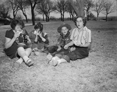 Two hundred children from the public schools' exceptional classes and the Cerebral Palsy Treatment Center held their annual Easter outing as guests of Mr. and Mrs. William Johnson on the 700-acre Johnson ranch north of Fort Worth. Hot-dog-and-soda-pop time found Mrs. J. K. Wilson of 2904 Forest Park Blvd. have lunch with Janet Foster, 13; Doris Jean Carter, 7, and Sue Wilson, 9, left to right. Published in Fort Worth Star-Telegram, morning edition March 22, 1951.