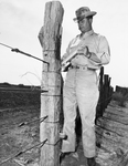 Ray Boothe tightens a strand on a pasture fence. He is putting in new staple-less fences, stringing the wire through holes bored into the wood posts. Published in Fort Worth Star-Telegram July 1951.