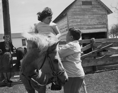 Sonja Marie Kelley, 9, of 1813 Galveston is given a lift aboard a pony by Billie Mitchell, 12, of 3613 Hemphill, at the picnic for exceptional children on the William Johnson ranch. Published in Fort Worth Star-Telegram, evening edition March 23, 1951.