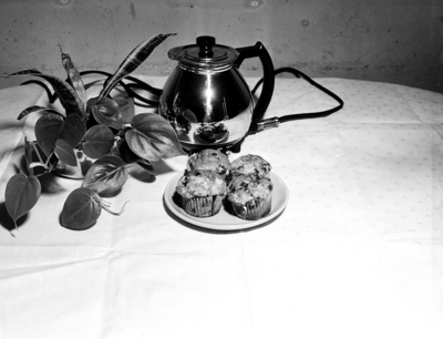 Image shows Blueberry muffins and a coffee pot on a table. Left of the coffee pot is a plant. Published in the Fort Worth Star-Telegram April 1951.