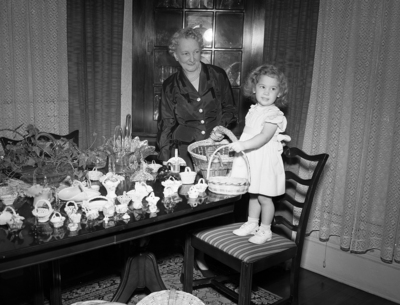 Little Paula Fae Andrews examines some of the baskets collected by her grandmother, Mrs. W. A. Jordan, 2612 Bomar Avenue.